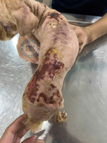 Ngày 08/08, một bạn nam tốt bụng đã bắt gặp em lang thang ở khu Tam Khương, Đống Đa, Hà Nội trong tình trạng rất đáng thương: lưng lở loét, một bên mắt rỉ kín, lông ngắn như mới được cắt cách đây không lâu nhưng bết máu, chân đi khập khiễng.