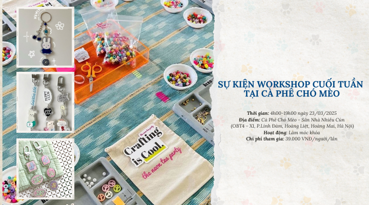 WORK SHOP BOKKEY-CHAIN - một dự án workshop trải nghiệm đầy tính sáng tạo và là sân chơi cực chill dành cho những bạn yêu chó mèo. Thời gian buổi workshop: 14h00-19h00 ngày 23/03/2025, tại Cà Phê Chó Mèo của Sân. Với chi phí tham gia: 39.000 VNĐ/người/lần (1 lượt được chọn tối đa 8 charm và 1 loại móc), bạn sẽ được thỏa sức sáng tạo những chiếc móc khoá mang tính cá nhân hoá rất cao, mang dấu ấn riêng của bạn.