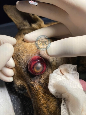 Đi lạc, rồi không may bị thương, mắt trái lồi ra ngoài, chân sau gãy, chỉ biết chui vào gầm cầu thang tàu điện trên cao ở ngã tư Khuất Duy Tiến. Vậy mà người ta lại "rình đánh để làm thịt" em chó đáng thương này.